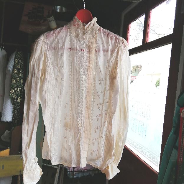 ビンテージの繊細なブラウスはレースのスタンドカラーで肩にはたっぷりのギャザーです。